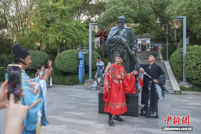 10月15日,江西贛州,兩岸新媒體人身著古裝,在郁孤臺的辛棄疾像前拍攝視頻素材。中新社記者 劉力鑫 攝