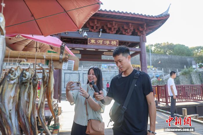 10月15日,江西贛州,兩岸新媒體人走上東河浮橋并拍攝視頻素材,東河浮橋始建于南宋乾道年間,全長約400米。中新社記者 劉力鑫 攝
