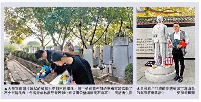 左圖:大陸電視劇《沉默的榮耀》受到兩岸關(guān)注。劇中吳石等先烈的英勇事跡感動了不少臺灣民眾。臺灣青年林彥辰最近到北京福田公墓緬懷吳石將軍。右圖:臺灣青年邱慶齡參訪福州市倉山區(qū)的吳石將軍故居。\受訪者供圖