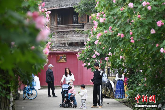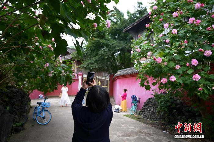10月28日,在四川省成都市明蜀王陵墻外,盛開的芙蓉花與紅墻黛瓦相互映襯,吸引不少市民前來打卡這一古風(fēng)古韻景觀。中新社記者 張浪 攝
