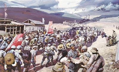 油畫《北上》創(chuàng)作于1996年,現(xiàn)藏于中國人民革命軍事博物館,描繪的是紅2、紅4方面軍在四川甘孜地區(qū)勝利會師后,告別甘孜群眾繼續(xù)北上,為實現(xiàn)大會師向陜甘根據(jù)地進發(fā)的場景?! ?/p>