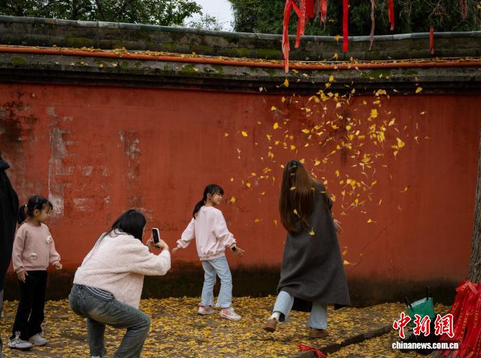 圖為游人在銀杏樹下玩耍拍照。韓金雨 攝