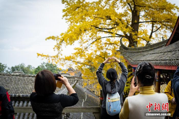 圖為游人在銀杏樹旁拍照打卡。韓金雨 攝