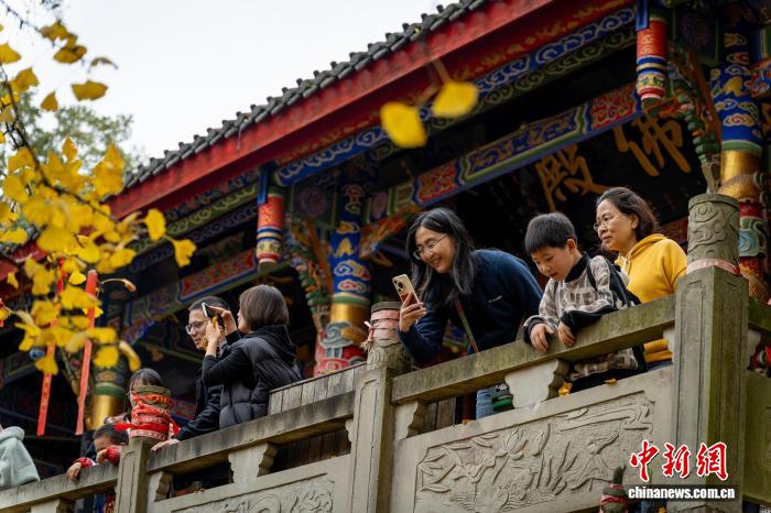 11月9日,成都市金堂縣云頂山慈云寺內的兩棵千年古銀杏呈現大面積黃葉,吸引眾多市民游客前來觀賞游玩。據悉,這兩棵千年古銀杏樹圍超5米,樹高25米,為一雌一雄,稱為“夫妻樹”,曾獲評“天府十大古銀杏”稱號。圖為千年銀杏“夫妻樹”。(無人機照片)韓金雨 攝