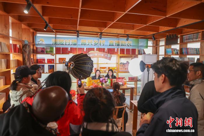 圖為中外嘉賓在湖陂村的靈感書屋觀摩助農(nóng)直播。中新社記者 劉力鑫 攝