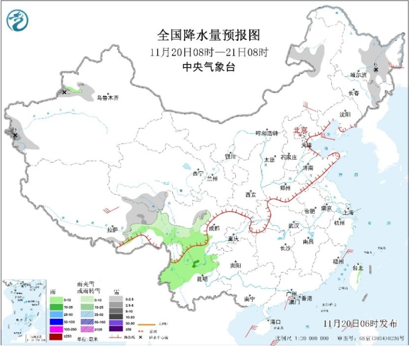 中新網(wǎng)11月20日電 據(jù)中央氣象臺網(wǎng)站消息,昨日,我國沒有明顯降水出現(xiàn),寒潮影響過后大部地區(qū)氣溫有所回升。預(yù)計今明兩天,全國大部地區(qū)仍會維持降水稀少的狀態(tài),西南地區(qū)有弱雨雪天氣;冷空氣處于間歇期。