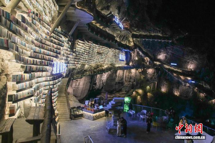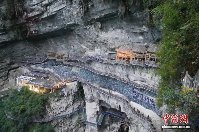 11月20日,廣西河池市羅城仫佬族自治縣棉花村深洞屯棉花天坑旅游度假區(qū),不少游客專程前來(lái)“打卡”網(wǎng)紅懸崖書店。該書店在“天坑”中沿崖壁而建,在不破壞原有地貌的前提下與自然景觀深度融合,為游客提供藝術(shù)空間和奶茶、咖啡等主題消費(fèi)場(chǎng)景。從今年5月開業(yè)至今,累計(jì)接待游客超10萬(wàn)人次。中新社記者 陳冠言 攝