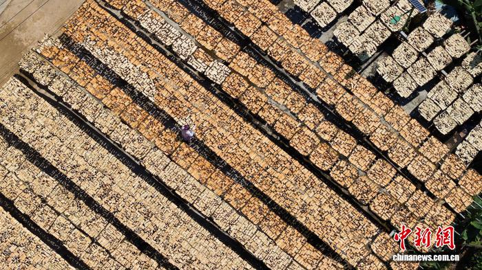 11月21日,在廣西田林縣六隆鎮(zhèn)平細(xì)村,村民在房頂和庭院晾曬八渡筍。(無人機照片)黃少鴻 攝
