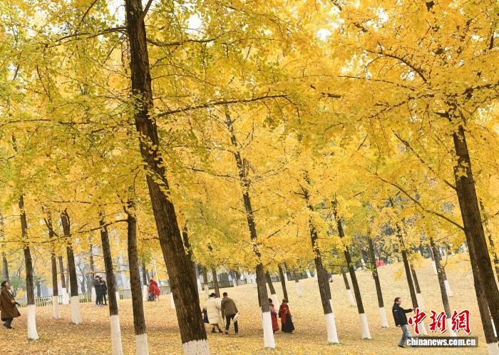 12月2日,重慶中央公園內(nèi)的大面積銀杏葉金黃滿枝,吸引民眾前往欣賞。圖為市民在銀杏林下游玩。中新社記者 周毅 攝