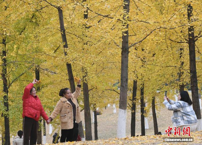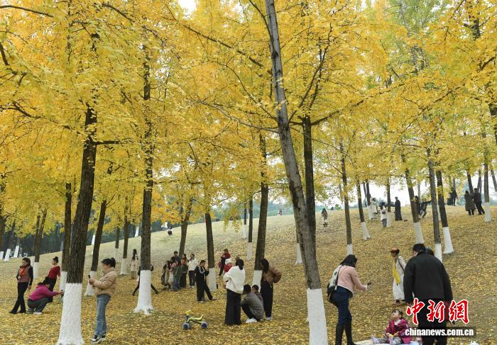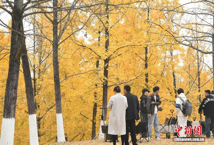 12月2日,重慶中央公園內(nèi)的大面積銀杏葉金黃滿枝,吸引民眾前往欣賞。圖為市民在銀杏林下拍照留影。中新社記者 周毅 攝