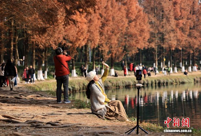 12月15日,游客在水杉樹下拍照。當(dāng)日,冬日暖陽下的四川省成都市升仙湖公園,盡染“紅妝”的水杉林吸引游人打卡拍照。中新社記者 王磊 攝
