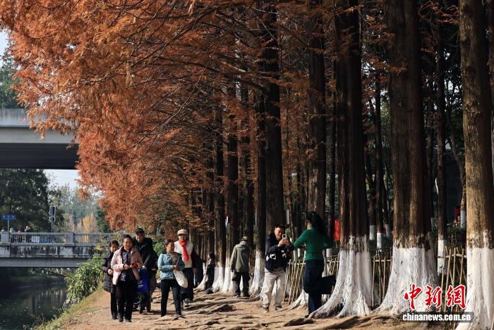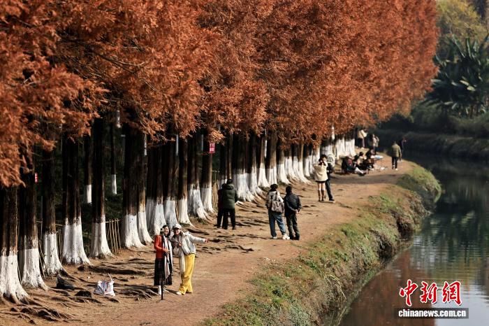 12月15日,游客在水杉樹下休閑漫步。中新社記者 王磊 攝