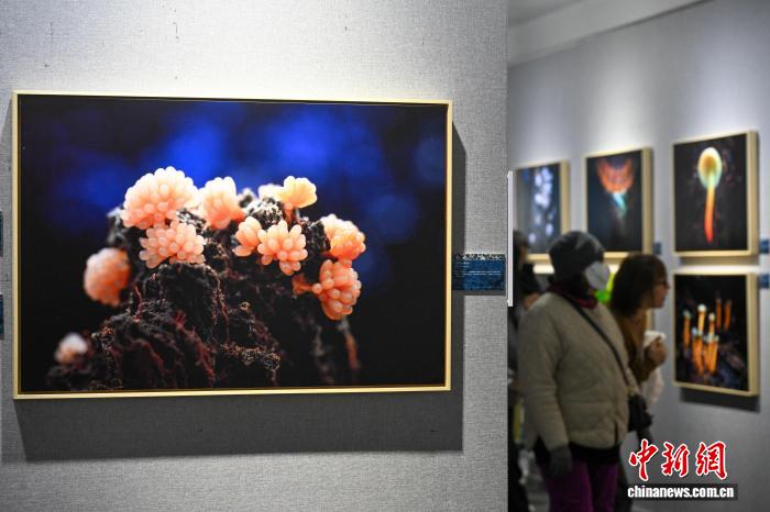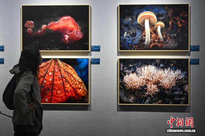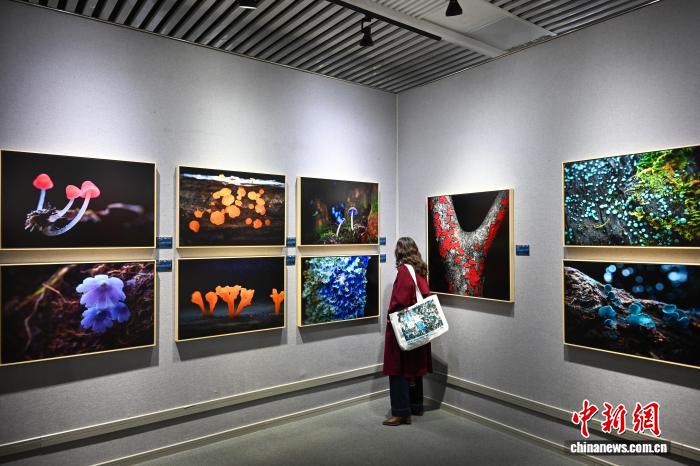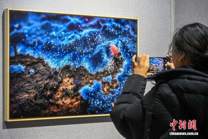 12月17日,展出作品《菇璃菇璃》吸引觀眾拍照。當(dāng)日,“蘑幻菌物——高黎貢山真菌類多樣性攝影藝術(shù)展”在位于昆明市的云南省圖書館開展,展覽以攝影藝術(shù)作品及衍生出的繪畫作品、藝術(shù)周邊作品為媒介,探秘“世界物種基因庫”高黎貢山,揭開真菌王國鮮為人知的奇幻與瑰麗。中新社記者 李嘉嫻 攝