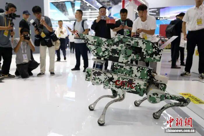 圖片2024年11月13日,第十五屆中國航展中國電子科技集團有限公司展位展出的四足機器人吸引參觀者。第十五屆中國國際航空航天博覽會于11月12日至17日在珠海國際航展中心舉行。 中新社記者 富田 攝