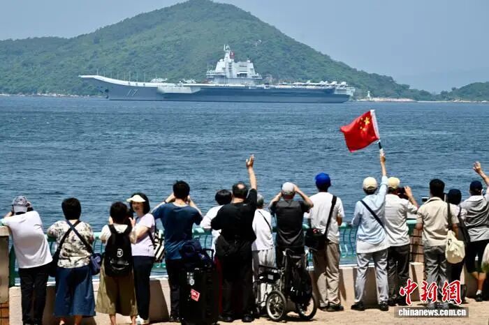 圖片2025年7月7日,由中國人民解放軍海軍航空母艦山東艦,導(dǎo)彈驅(qū)逐艦延安艦、湛江艦及導(dǎo)彈護衛(wèi)艦運城艦組成的航母編隊完成在香港的訪問活動,離開香港海域。圖為當(dāng)天上午,香港民眾手持國旗在海怡半島海濱送別山東艦航母編隊。 中新社記者 李志華 攝