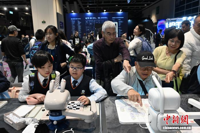 圖為展覽現(xiàn)場,長者們(右)與AI機器人進行中國象棋對弈,學生們與AI機器人進行國際象棋對弈。中新網(wǎng)記者 李志華 攝
