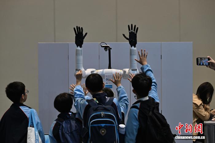圖為學生們觀看現(xiàn)場機器人。中新網(wǎng)記者 李志華 攝