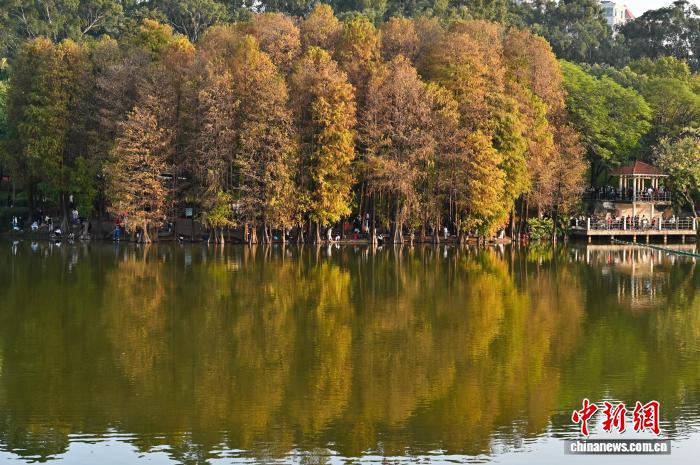 12月27日,廣東省廣州市麓湖公園的不少落羽杉換上“冬裝”,由綠色轉(zhuǎn)為古銅色或紅褐色,吸引游客游園觀景。中新社記者 陳楚紅 攝