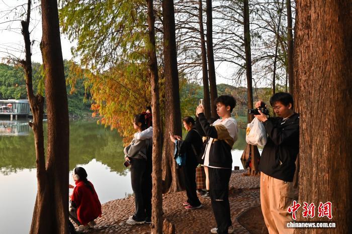 12月27日,廣東省廣州市麓湖公園的落羽杉換上“冬裝”,由綠色轉(zhuǎn)為古銅色或紅褐色,吸引游客游園拍照。中新社記者 陳楚紅 攝