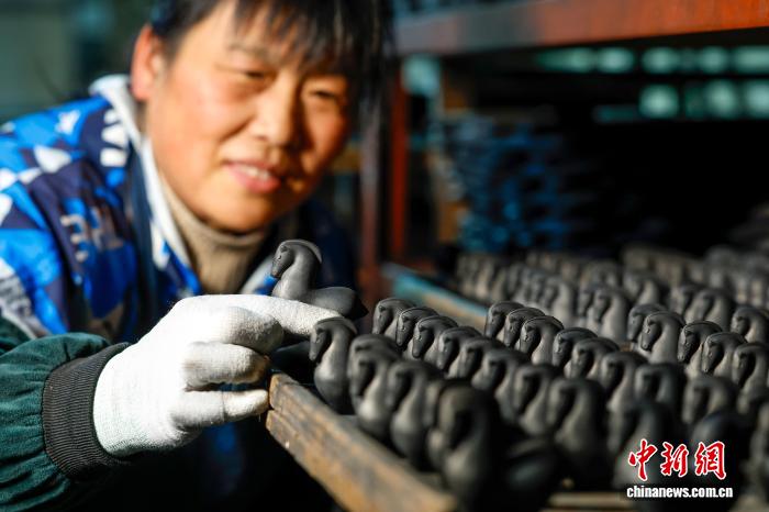 1月5日,臨近馬年新春,在安徽省黃山市歙縣老胡開文墨廠,制墨手藝人巧妙融入“馬年元素”,打造出系列主題徽墨,讓古老的徽墨技藝以年輕新潮的方式出圈出彩。圖為制墨手藝人正在晾曬“立體唐馬墨”。施亞磊 攝