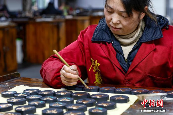 1月5日,臨近馬年新春,在安徽省黃山市歙縣老胡開文墨廠,制墨手藝人巧妙融入“馬年元素”,打造出系列主題徽墨,讓古老的徽墨技藝以年輕新潮的方式出圈出彩。圖為制墨手藝人正在給馬年主題徽墨描金。施亞磊 攝