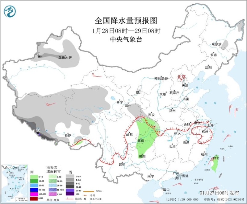 1月28日08時至29日08時,新疆北疆北部和沿天山一帶地區(qū)、西藏大部、青海大部、甘肅南部等地部分地區(qū)有小到中雪,其中,西藏西南部等地部分地區(qū)有大到暴雪,局地大暴雪(20~25毫米)。陜西南部、湖北南部和西部、四川盆地東部、重慶大部、貴州中北部、臺灣島大部等地部分地區(qū)有小雨。西藏北部、甘肅河西等地部分地區(qū)有4~5級風(fēng)。臺灣海峽、臺灣以東洋面、巴士海峽、南海東北部海域?qū)⒂?~7級風(fēng)、陣風(fēng)8級,黃海中部和南部海域、東海大部海域、南海大部海域?qū)⒂?~6級風(fēng)、陣風(fēng)7級。