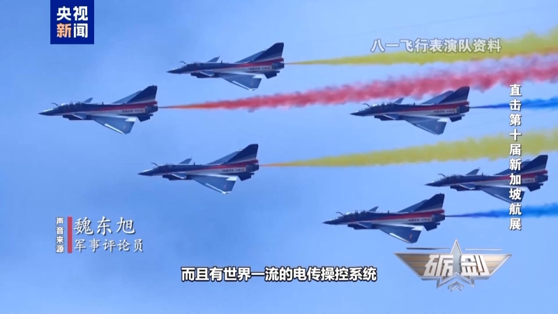 軍事評論員 魏東旭:六機同步橫滾是非常有難度的。殲-10C六機編隊是以一種密集的編隊同步進行橫滾。先進噴氣式戰(zhàn)斗機距離比較近,飛機之間是有氣流干擾的。還要進行同步的橫滾動作,對于飛行員操控飛機,還有飛機的性能都提出了很高的要求。