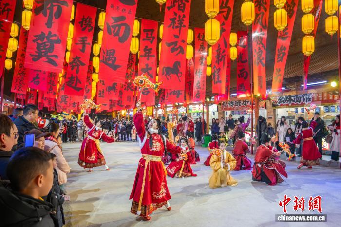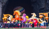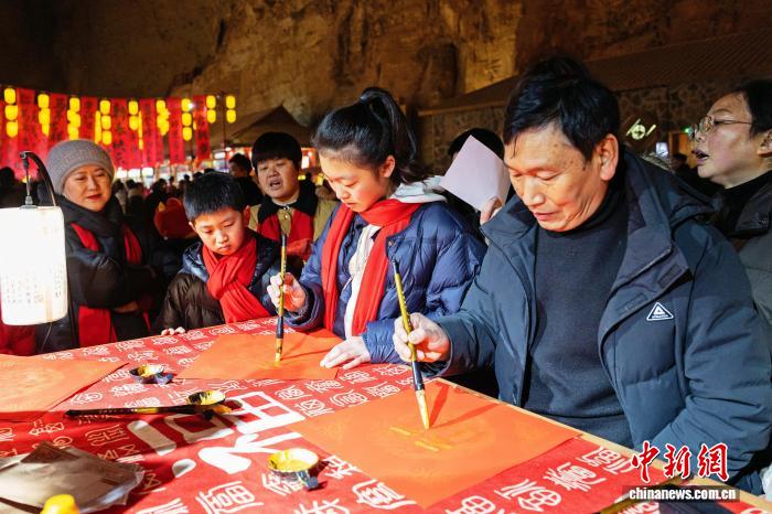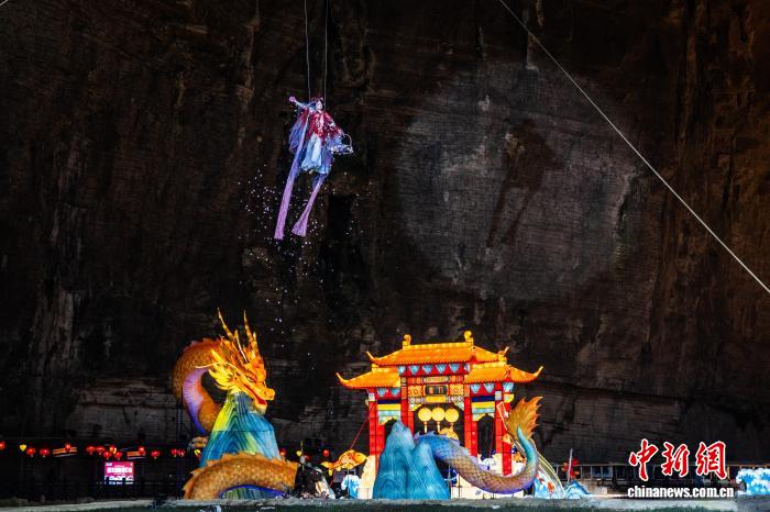 2月10日,在湖北省恩施土家族苗族自治州利川市騰龍洞景區(qū),糅合了地質(zhì)奇觀、本土非遺與新春民俗的新春奇幻燈會(huì)熱鬧上演,為游客帶來一場(chǎng)光影交融的沉浸式文化體驗(yàn)之旅。據(jù)了解,此次燈會(huì)是2026年全國“我們的節(jié)日·春節(jié)”主題文化活動(dòng)的重要組成部分。騰龍洞是世界地質(zhì)公園,洞穴總面積200多萬平方米,容積總量居世界第一位。圖為游客在騰龍洞洞口欣賞“駿馬踏春”彩燈。杜維 攝