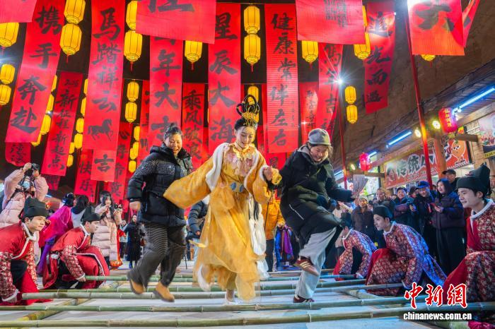 圖為游客體驗(yàn)跳“竹竿舞”。杜維 攝