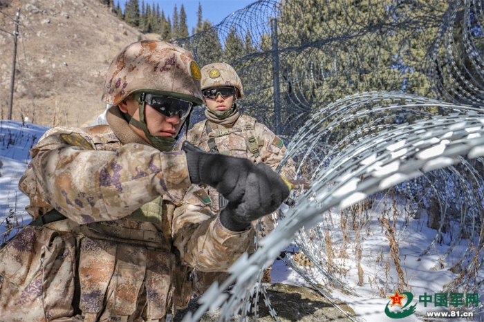 官兵在巡邏途中修繕鐵絲網(wǎng)。張旭 攝