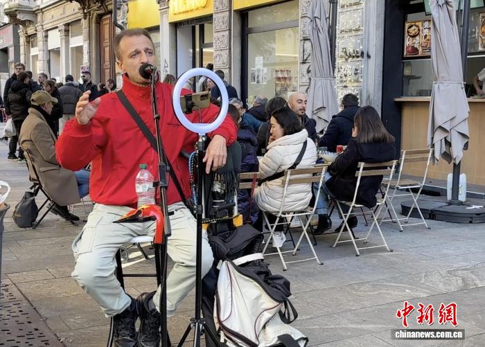 人聲鼎沸中,一段中文歌聲穿透人潮,由遠及近,漸漸清晰。人們聞聲望去,街角竟是一名身穿紅色外套的意大利男子,他身旁擺著便攜音響,面前架著手機支架,屏幕上滾動著中文歌詞。話筒貼近唇邊,他唱得投入,咬字雖帶著些許口音,卻穩(wěn)穩(wěn)地落在節(jié)拍上。