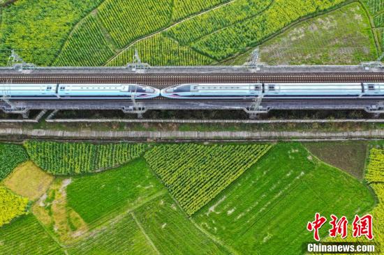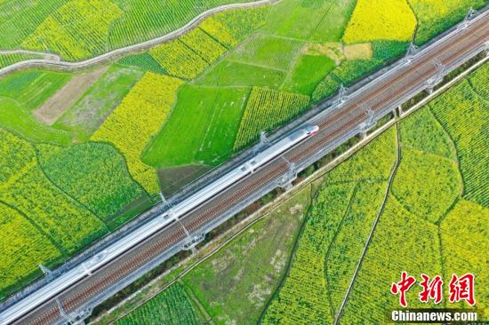 3月13日,航拍“復(fù)興號(hào)”動(dòng)車組從油菜花田駛過(guò)。瞿宏倫 攝