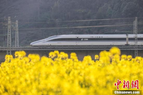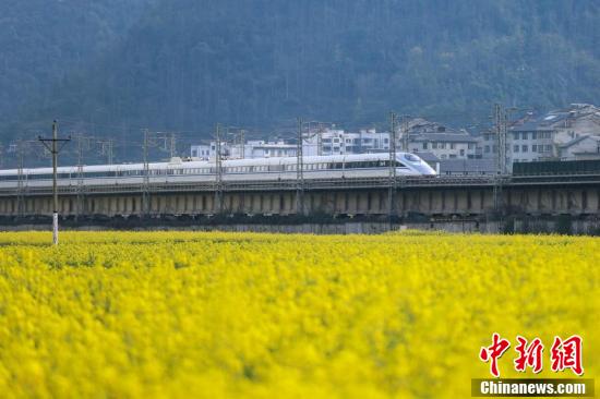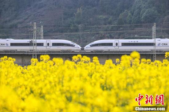 3月5日,動(dòng)車組列車從渝貴鐵路貴州省遵義市匯川區(qū)板橋鎮(zhèn)境內(nèi)的油菜花田旁駛過(guò)。隨著氣溫回升,匯川區(qū)境內(nèi)的油菜花競(jìng)相綻放,田間春意盎然。