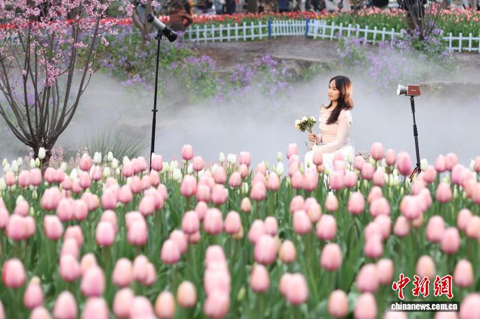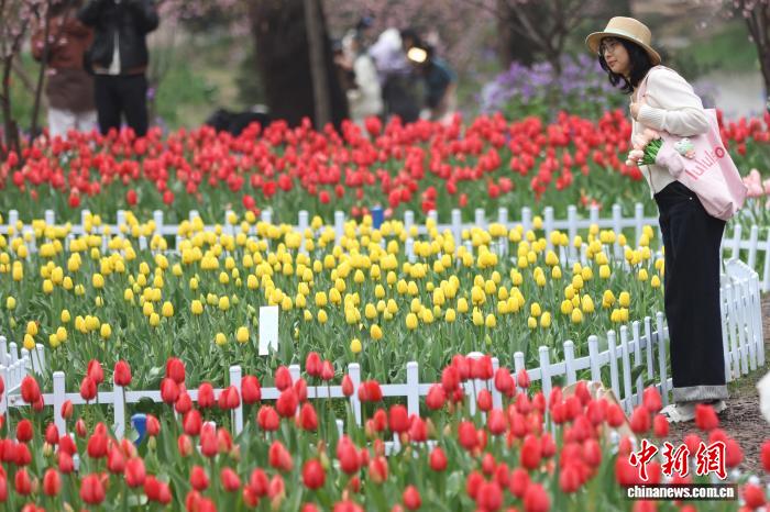 3月19日,江蘇南京,年輕人在郁金香旁拍攝照片。近日,南京紫金山一場以郁金香為主角的“春日花事”吸引眾多市民和游客前來,春之獻禮、流動的莫奈花園等主題景觀融合多元藝術(shù)表達,勾勒出一幅層次豐富的春日畫卷。中新社記者 泱波 攝