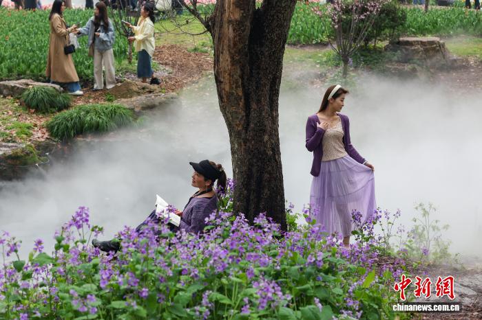 3月19日,江蘇南京,年輕人在霧氣升騰的景致中拍攝照片。中新社記者 泱波 攝