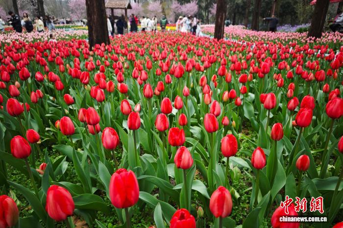 3月19日,江蘇南京,綻放的郁金香呈現(xiàn)火紅的景致。中新社記者 泱波 攝