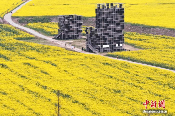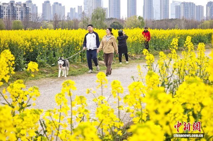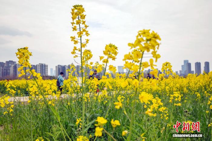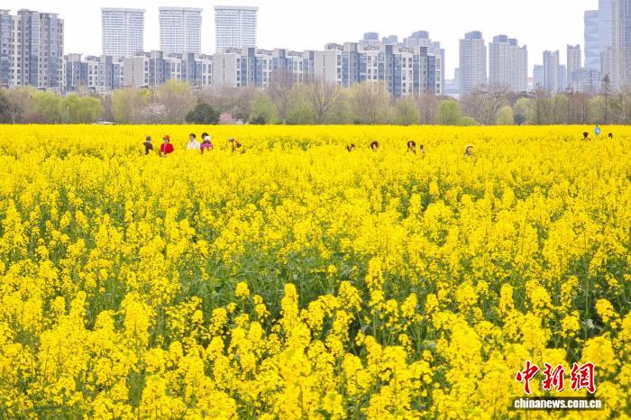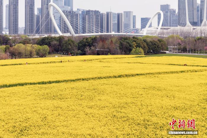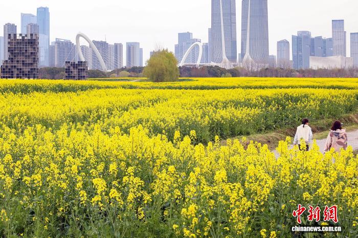 3月23日,江蘇南京,位于長江中的江心洲一處油菜花地花開正盛,與城市樓宇相呼應,景美如畫。中新社記者 泱波 攝