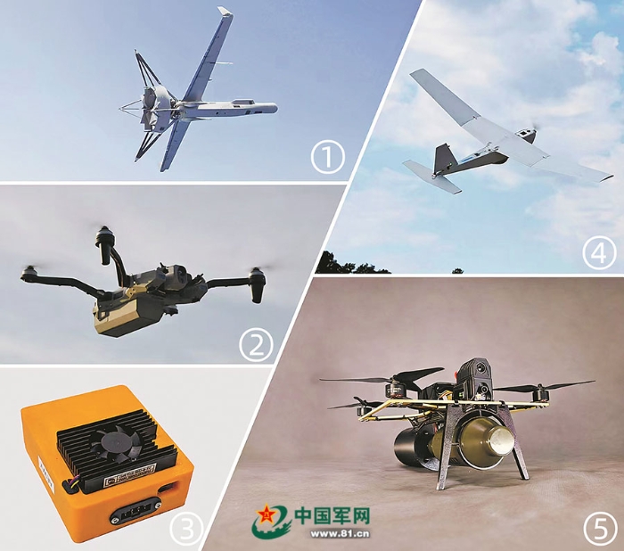圖①:美國(guó)V-BAT無人機(jī)。圖②:美國(guó)“黑寡婦”戰(zhàn)術(shù)偵察無人機(jī)。圖③:烏克蘭Twist Robotics公司推出的視覺導(dǎo)航模塊。圖④:美國(guó)RQ-20無人機(jī)。圖⑤:俄羅斯KVN光纖無人機(jī)。