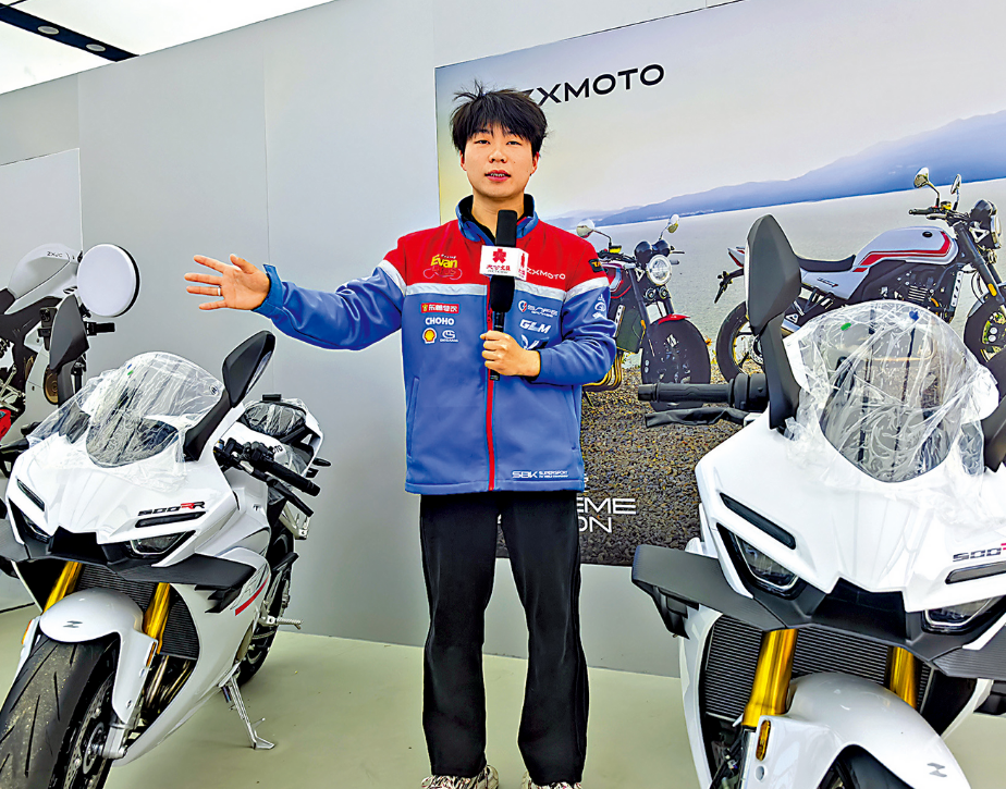 在武漢,銷售人員介紹“張雪機車”的性能。(大公報記者 張帥 攝)