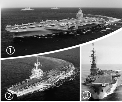 圖①:“自由法國”號核動力航母(概念圖)。圖②:“戴高樂”號核動力航母。圖③:“福煦”號常規(guī)動力航母。